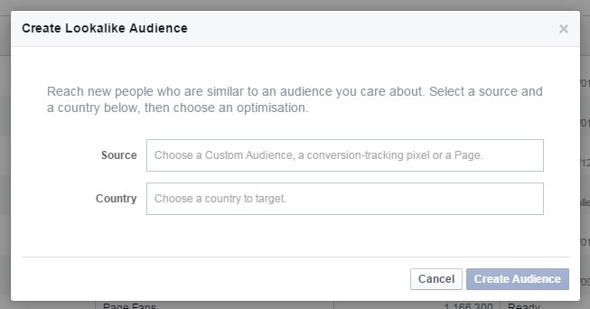 - If you haven’t already done so, go to the Audiences section of Facebook Adverts Manager and start creating some lookalike audiences from your existing fans